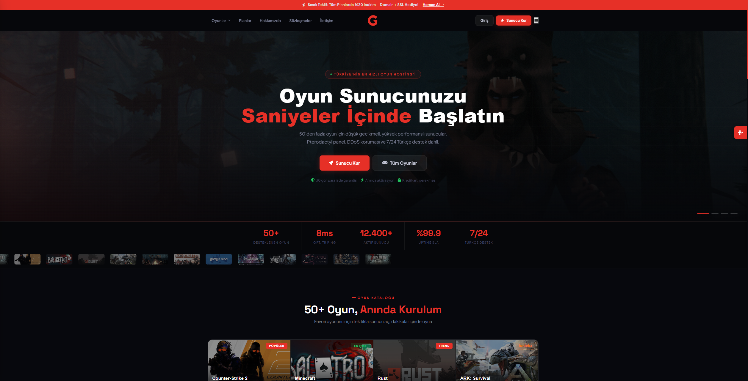 • Kampanya ve istatistik alanları (%99.9 uptime, ping vs.)